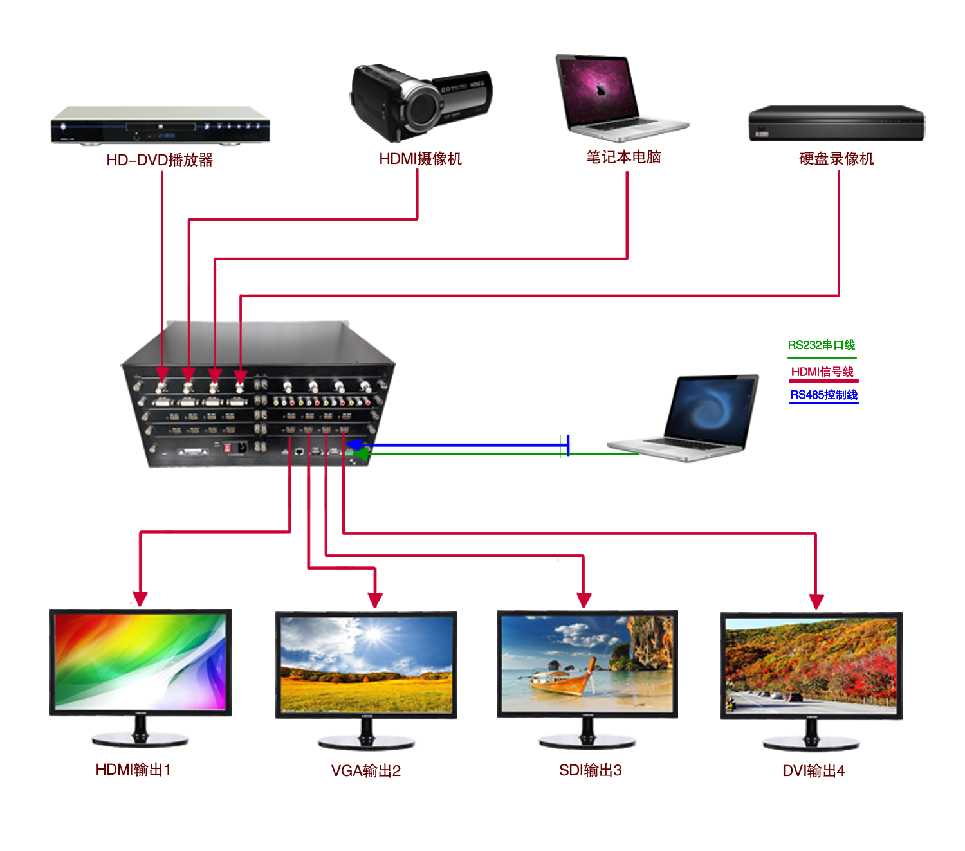 高清混合矩阵切换器完美适配:通过多格式信号接入功能,将不同来源信号集中处理,配合拼接屏实现 “路况监控 + 数据报表 + 会议画面” 的同步显示,助力调度决策效率提升。
