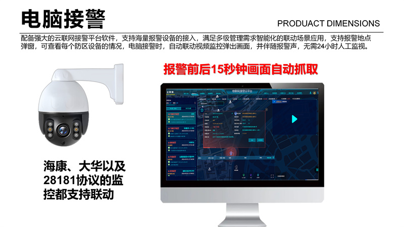 设备采用主呼叫键 + 附按键组合设计,内置语音喇叭与状态指示灯,支持真人语音导航与现场声光提示,可外接 5V 喇叭强化警示效果。一键触发后自动轮播拨号,同步推送电话、短信、微信小程序、APP 及 PC 平台报警信息,支持双向语音对讲,便于后台快速指挥处置。支持防区名称自定义、一键分享设备、远程布撤防与配件绑定,报警时自动抓取前后 15 秒视频画面,兼容海康、大华及 ONVIF/28181 协议监控联动,实现弹窗定位与视频同步查看。