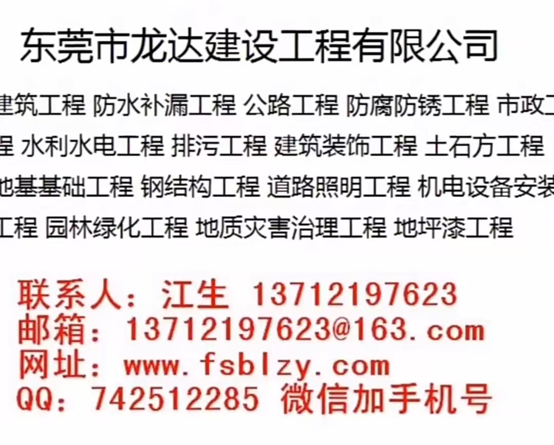 东莞市龙达建设工程有限公司成立于2019年,是一家专业承接防水补漏工程;防腐防锈工程;公路工程;市政工程;水利水电工程;地基基础工程;土石方工程;排污工程;钢结构工程;建筑装饰工程;地质灾害治理工程;道路照明工程;机电设备安装;园林绿化工程;地坪漆工程、家庭、房屋、厂房、学校等防水及单位防水工程.屋顶防水补漏,卫生间防水堵漏,外墙外窗防水堵漏,阳台露台防水,楼顶防水补漏,厨房防水,地下室整体做防水堵漏,彩钢房顶做防水,房屋漏水维修,各种水池防水游泳池防水,楼顶花园防水施工,东莞防水工程,广州防水,深圳防水,中山防水,佛山防水,惠州防水,河源防水,等各市专业防水堵漏公司。