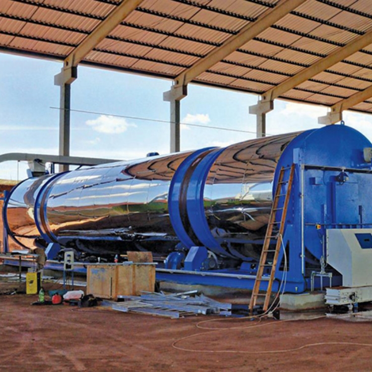 滚筒式生物反应器结构主要由反应器筒体、支承装置、传动装置、进出料装置、箱体等组成。进料装置上的进料口进人进料箱,物料随着筒体的转动在抄板的带动下充分混合,并在由筒体的进料端到出料端推进的过程中完成好氧发酵的整个过程。支承装置包括的主要部件有托轮、托轮轴、轴承、轴承支座等。托轮除起支承作用外,同时担负筒体转动的作用,避免筒体在转动中的产生过大的变形。当筒体转动时托轮装置随之共同转动,可大幅度减小与筒体之间的直接摩擦,延长反应器的使用寿命。筒体倾斜的角度使得进料端筒体较高,出料端筒体较低。滚筒式反应器采用摩擦传动,传动装置结构简单维护方便。依靠调速电机保证足够的调速范围。